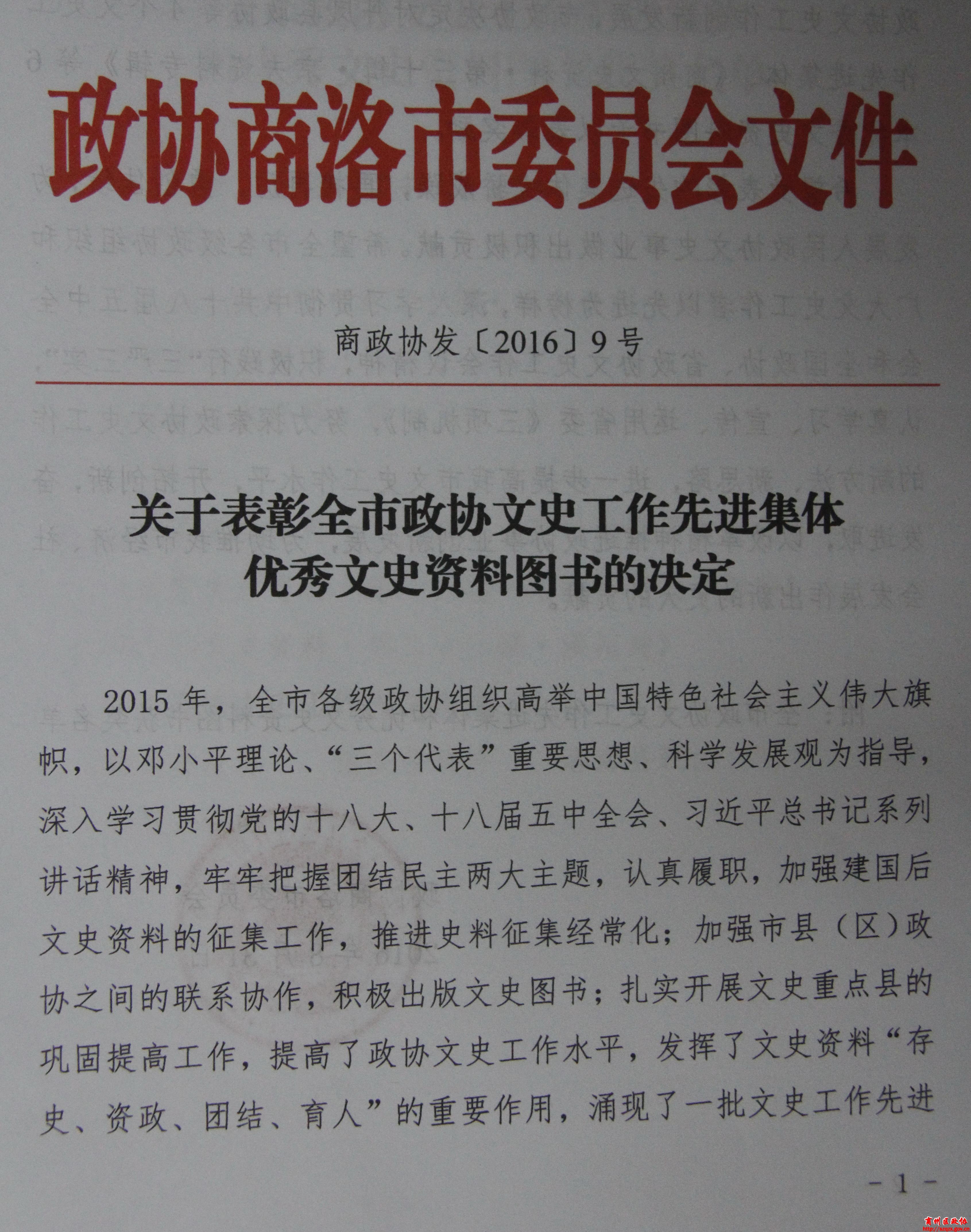 2015年度商州区政协编辑出版第30辑文史史料《京夫资料专辑》被评为全市政协优秀资料图书一等奖。在市政协召开的全市文史宣传工作会上,熊道宇副主席向区政协文史学习工委主任房强现场举行颁奖。