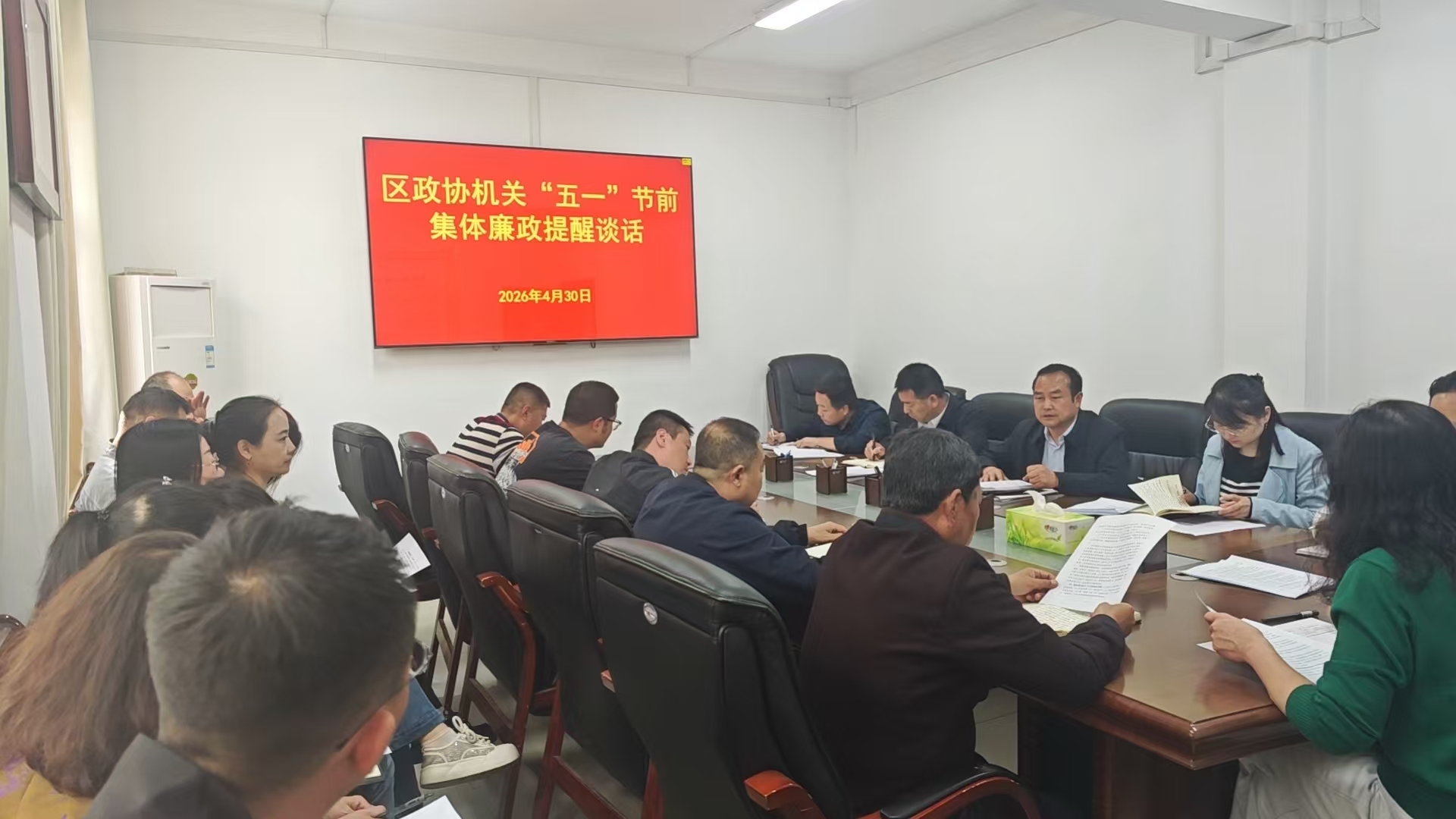 为进一步巩固拓展深入贯彻中央八项规定精神学习教育成果,持续强化清廉机关建设,营造风清气正的节日氛围。4月30日,区政协机关召开“五一”节前集体廉政提醒谈话会,区政协党组成员、秘书长雷锋主持会议并讲话。